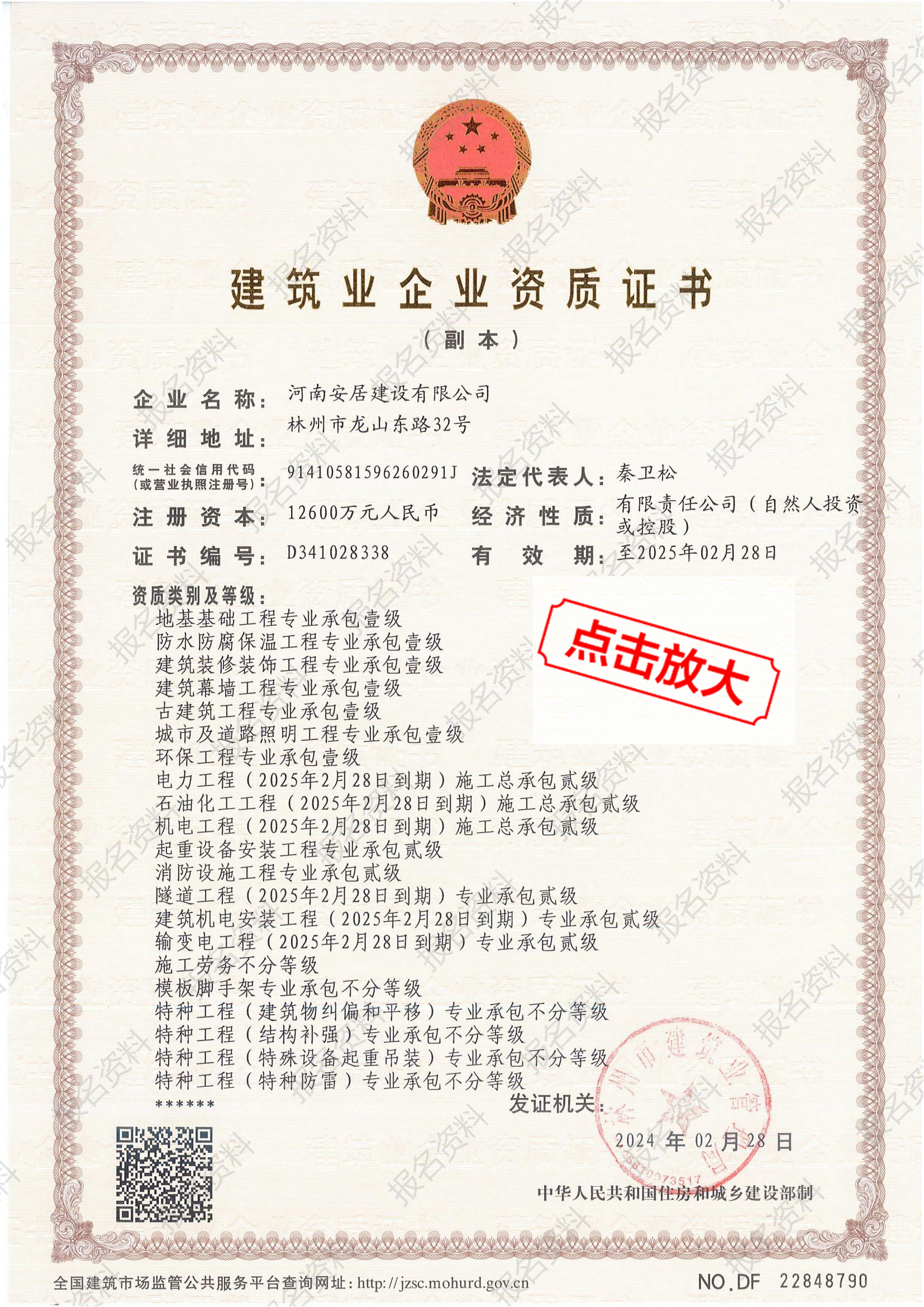 滔滔黃河哺育了中華民族拼搏向上的奮斗精神,巍巍太行造就了中原兒女的紅旗渠精神。百萬林州人下太行,鑄就了中國建筑之鄉(xiāng)響當當?shù)囊燮放啤:幽习簿咏ㄔO(shè)有限公司從誕生起血液里就流淌著紅色基因,秉承“安得廣夏千萬間,大庇天下寒士俱歡顏”的擔當精神,用鋼筋混凝土筑起了高樓大廈,也用一流品質(zhì)、家國情懷打造了安居建設(shè)的輝煌成績。公司成立于2012年,注冊資金12600萬元,公司成立至今,擁有建筑,市政施工總承包等十項一級資質(zhì);其他二級等資質(zhì)共二十余項。公司秉承質(zhì)量第一,服務(wù)為主,堅持垂直管理,從不設(shè)立分公司等分支機構(gòu)。